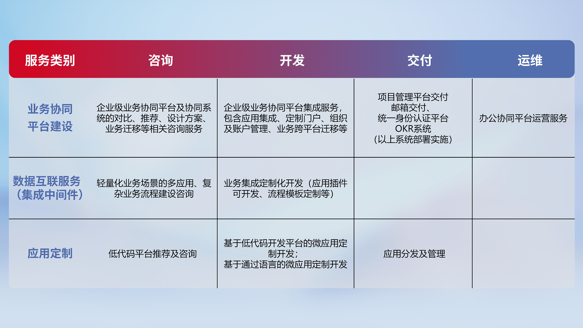 针对钉钉、、企微、、、IDaas等平台级产品提供产品的规划、、、方案、、、交付、、、定制化开发等服务,,,,实现如统一协同办公、、、智能客户服务、、、混合会议管理、、、、智能数据查询、、、等业务场景,,实现数字化转型。。。。
