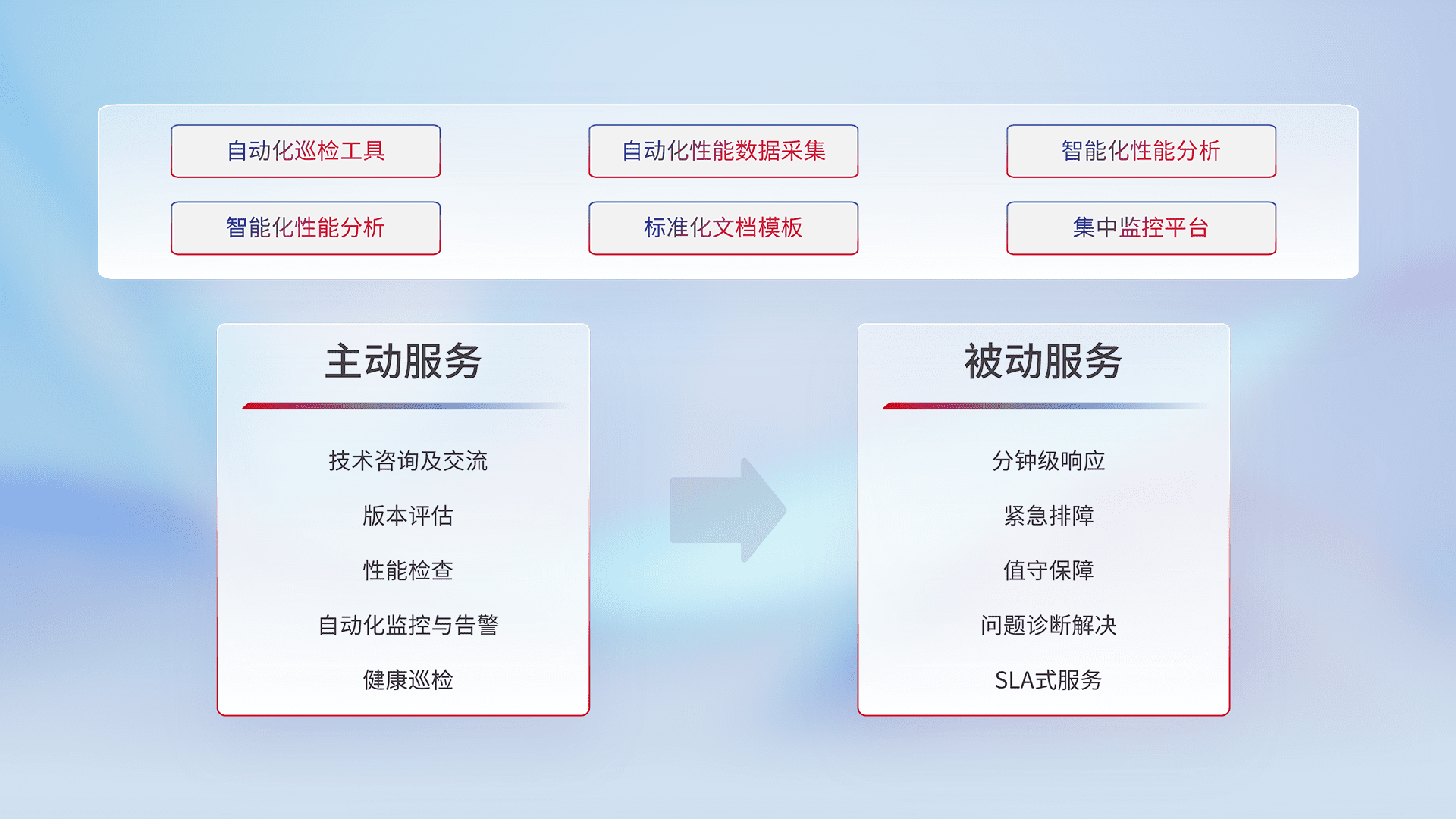 智能化工具和标准化文档,,保障服务质量,,,,提供主动服务(包含技术咨询、、、版本评估、、性能检查、、自动化监控与告警、、、健康巡检)和被动服务包含(分钟级响应、、、紧急排障、、、、值守保障、、问题诊断解决、、SLA服务)。。。。